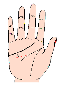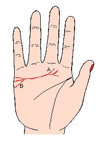 感情線的末端,有一小橫切線(記號A),表示與愛人離別后,感情不能像原先那樣好;