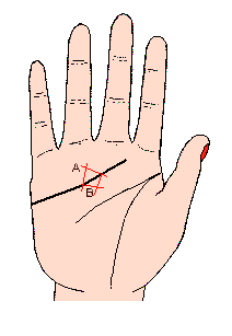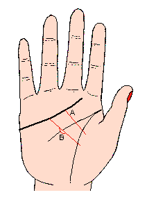 如果有這條線,則以勁而有力,成一直線為最理想,主健康活力強,在性的方面也頗有魅力,同時生活也很穩定;相反地如果這條線沒有氣力,又斷斷續續的話,表示身體衰弱,也失去性的魅力,健康線應以下端不碰到生命線為真健康(記號A),如果健康線越過生命線,表示內臟尤其循環器之衰弱(記號B)。