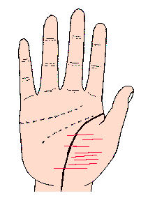婚姻線又名(愛情線、結合線)在水星丘側(小指根部掌邊),感情線上方,所刻劃的短短橫線,有時出現幾條,但以最長最明顯的一條為準,這條線不但表示結婚運,也可以看出戀愛或色情關系。婚姻線的好壞務必要參照感情線,頭腦線,生命線三大線條,才能預知結婚或與異性之關系。