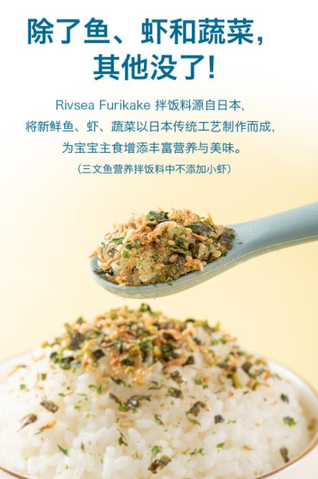 以禾泱泱營養拌飯料為例,主要包括小蝦拌飯料與三文魚拌飯料。純天然的海洋食材與蔬菜即產品的全部組成,利用食材的天然鮮味,不添加任何食用鹽、白砂糖、味精等調味品,提高了嬰幼兒對于天然食品的接受度,減少挑食偏食風險。