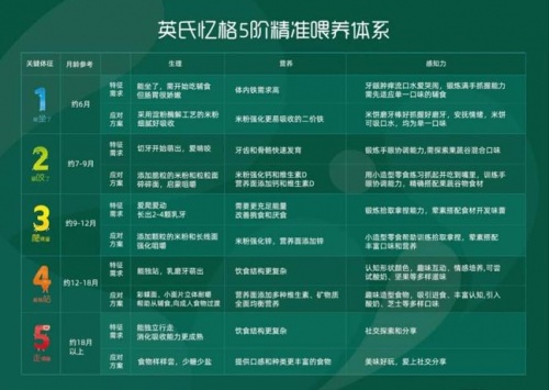 因為寶寶在各個階段都有不同的生理特點,英氏“輔食 5 階精準喂養體系”遵循了循序漸進的原則,在食物質地、種類上逐漸轉變,由細到粗,由少到多,讓寶寶有一個逐漸適應不同食物的過程,避免引起不適,同時也注重補充寶寶在不同生長發育階段需要的不同營養,而且提供的輔食都是采用綠色食材,先進工藝,力求為孩子提供健康的輔食。