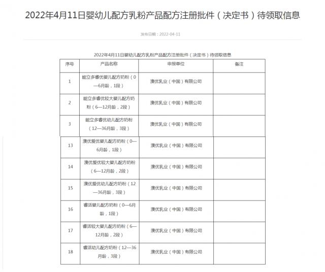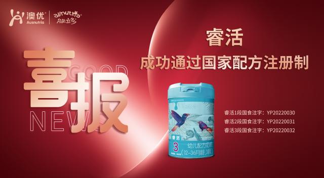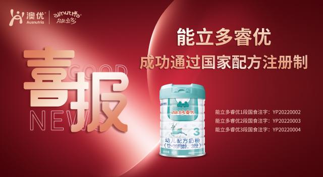 4月11日,國家市場監(jiān)管總局發(fā)布的最新一批“嬰幼兒配方乳粉產(chǎn)品配方注冊批件(決定書)待領(lǐng)取信息”,澳優(yōu)能立多旗下的澳優(yōu)愛優(yōu)嬰兒配方奶粉1段、澳優(yōu)愛優(yōu)較大嬰兒配方奶粉2段、澳優(yōu)愛優(yōu)幼兒配方奶粉3段、能立多睿優(yōu)嬰兒配方奶粉1段、能立多睿優(yōu)較大嬰兒配方奶粉2段、能立多睿優(yōu)幼兒配方奶粉3段、睿活嬰兒配方奶粉1段、睿活較大嬰兒配方奶粉2段、睿活幼兒配方奶粉3段的9個(gè)配方獲得通過。