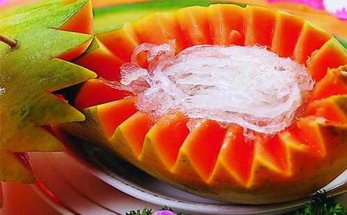 4、木瓜切開,去瓤,做成木瓜盅,將處理好的雪蛤,姜水,冰糖裝入木瓜盅內(nèi),上鍋,隔水文火蒸20分鐘即可食用。